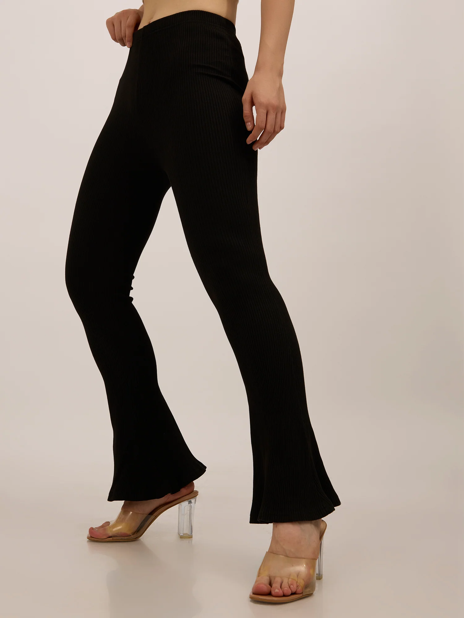 Make a chic statement in these black ribbed basic flared leggings. Its flattering flared silhouette and modern ribbed design are perfect for morning walks or a casual office environment. A comfortable and eye-catching choice for various daytime events and casual outings with friends.