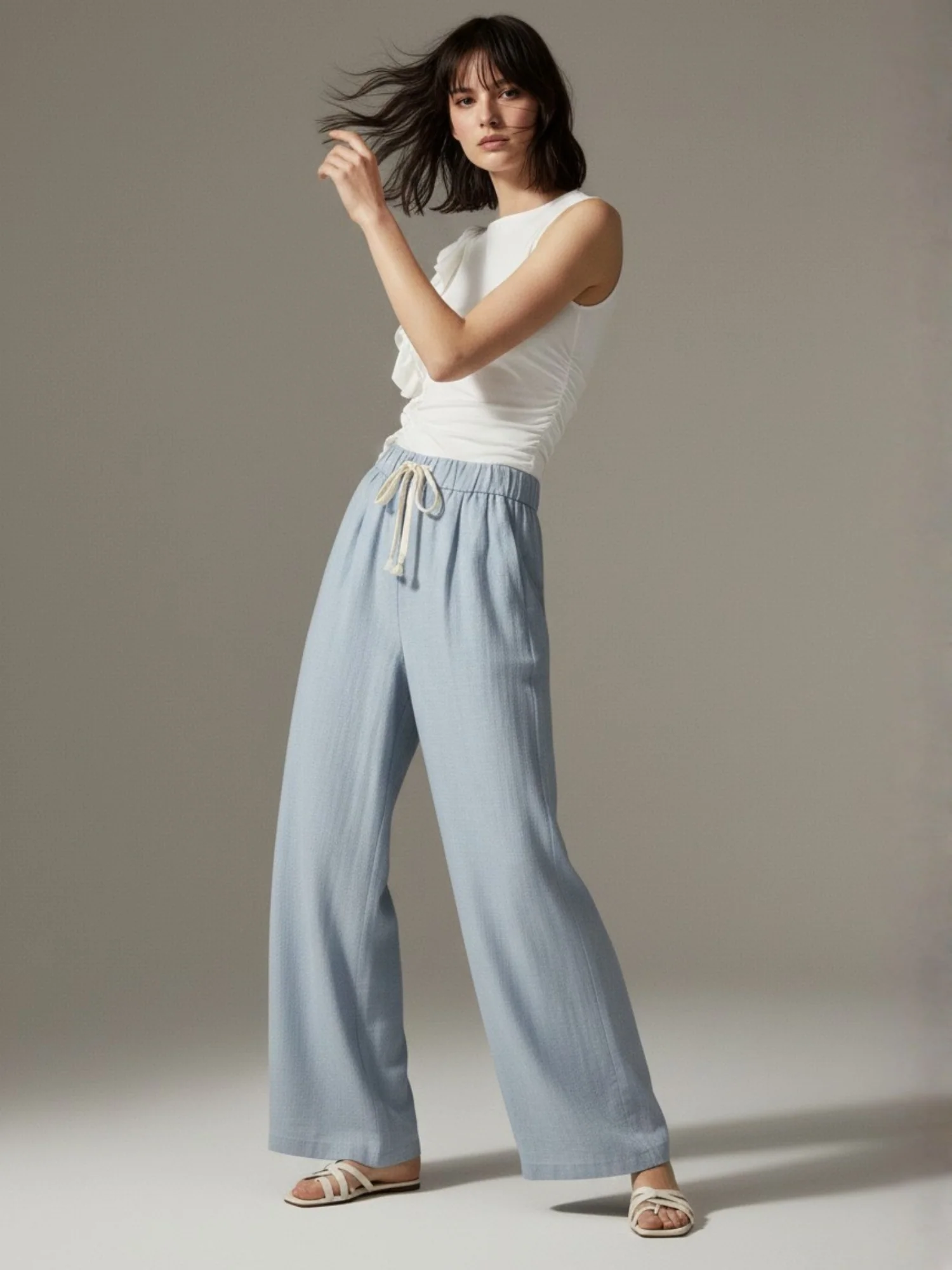 These blue high-waist drawstring pleated pants offer a relaxed yet put-together look. Perfect for creative workspaces or casual Fridays, the pleated detail adds a touch of sophistication. Style with a fitted knit top for a balanced, modern silhouette.