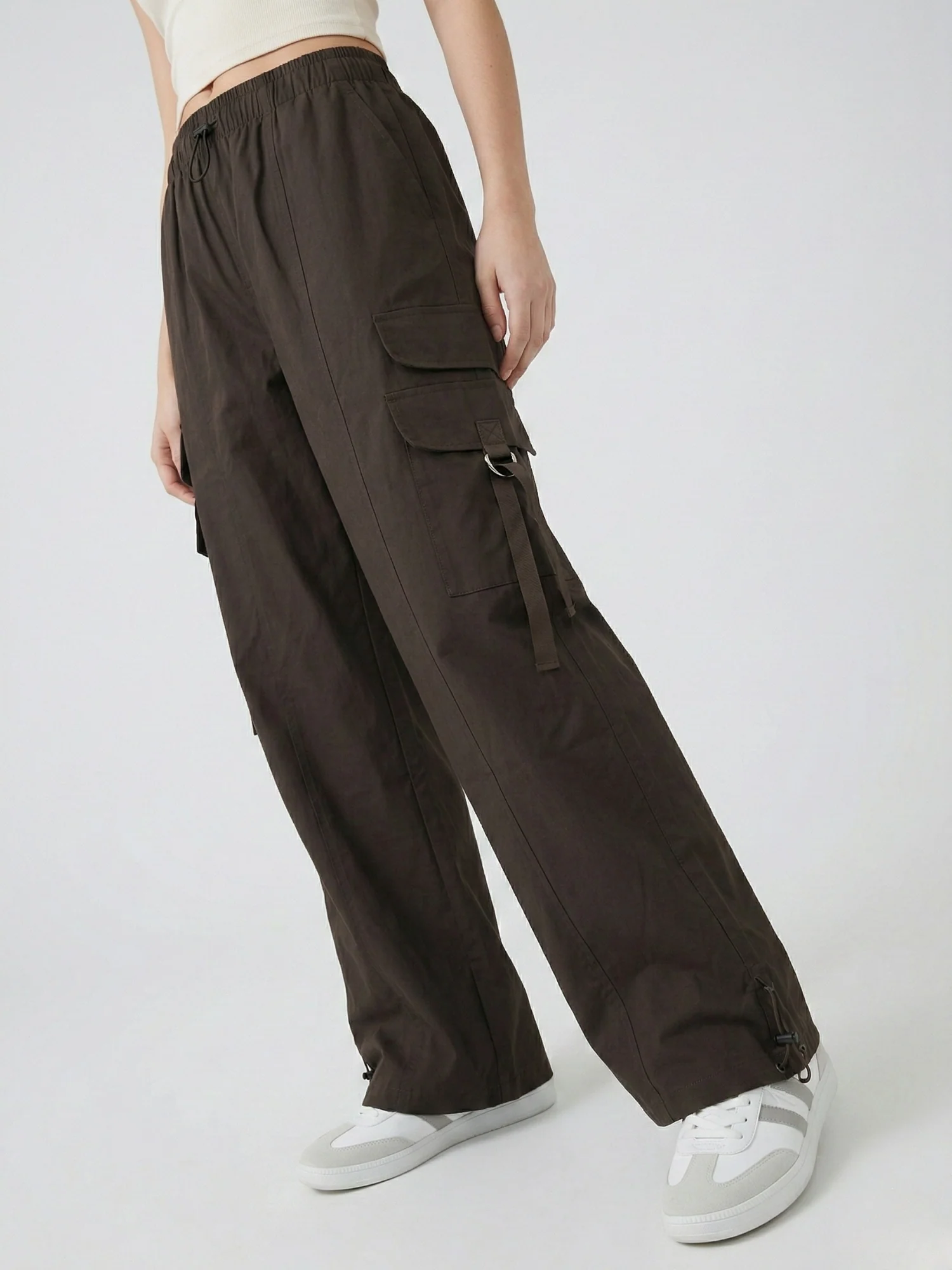 Embrace a utilitarian vibe with these brown cargo pants featuring functional pocket details. Ideal for casual outings or weekend travel, they pair perfectly with a fitted tee and sneakers for a comfortable yet trendy street-style look.