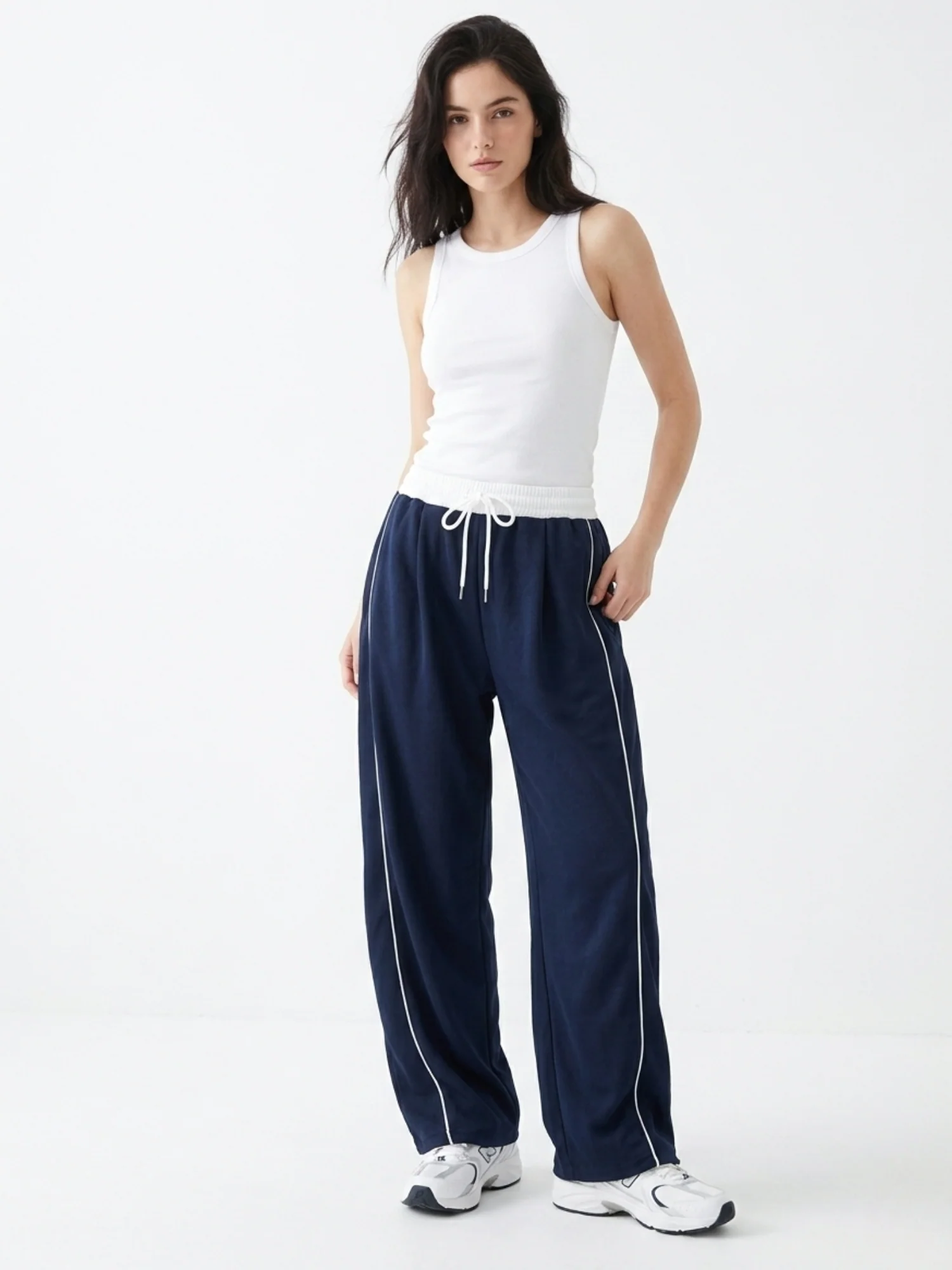 These navy blue wide-leg pants feature a stylish contrast waist, offering a sophisticated look for formal meetings or office wear. Pair them with a crisp white blouse and heels for a polished ensemble that highlights the high-waisted silhouette.