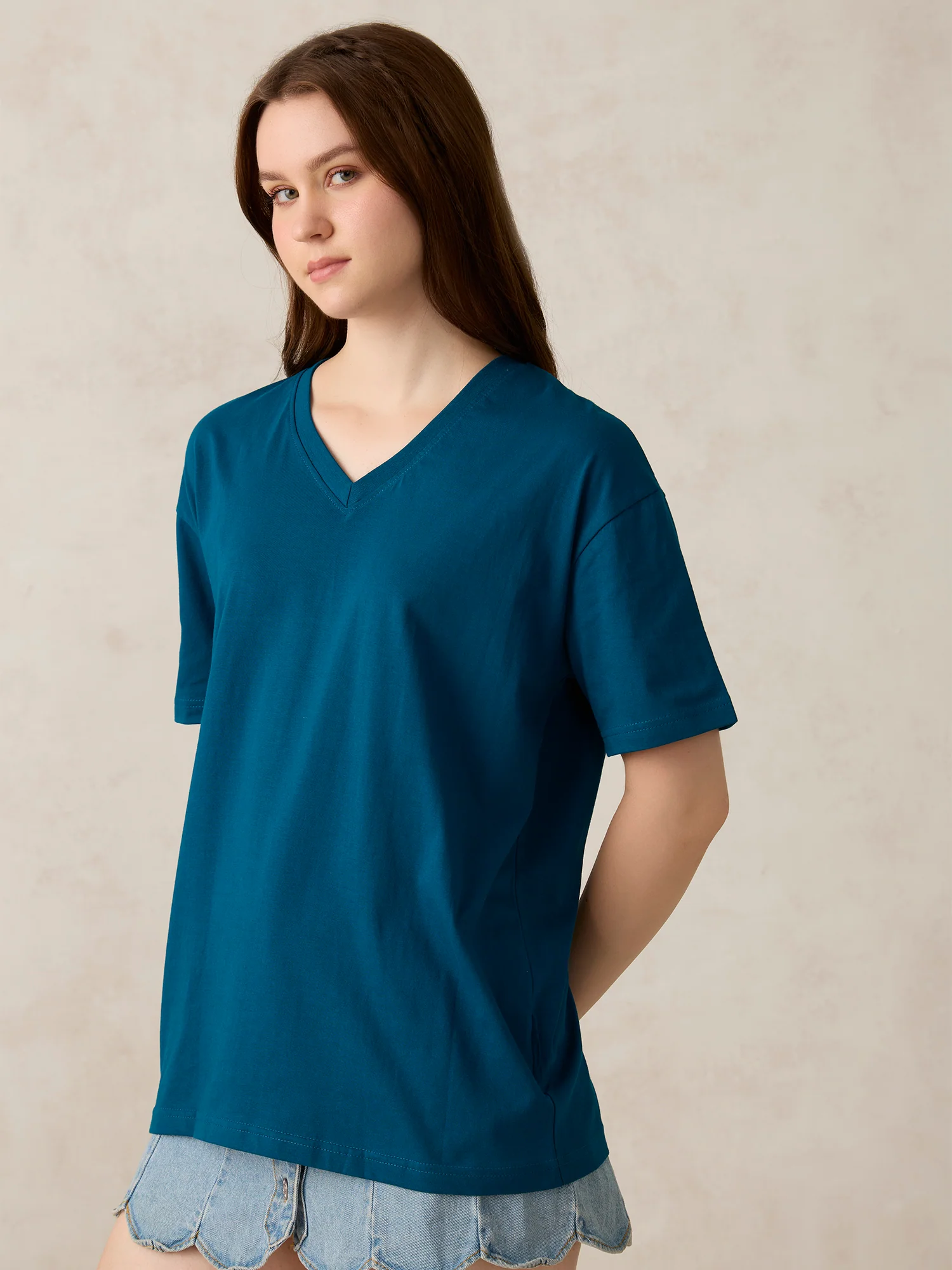 Experience ultimate comfort with this teal v-neck solid oversized t-shirt. The trendy oversized fit and vibrant teal hue make it perfect for airport looks or weekend lounging. A practical and stylish choice for running morning errands or simply staying relaxed at home.